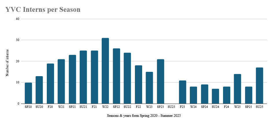 Additionally, the YVC is routinely capable of retaining interns as 46.2% of interns stay for longer than one season. Not only does this reflect a recognition of value by interns for committing more of their time to the organization, but also, with low turnover rates, the YVC has the capacity to engage in longer term projects.